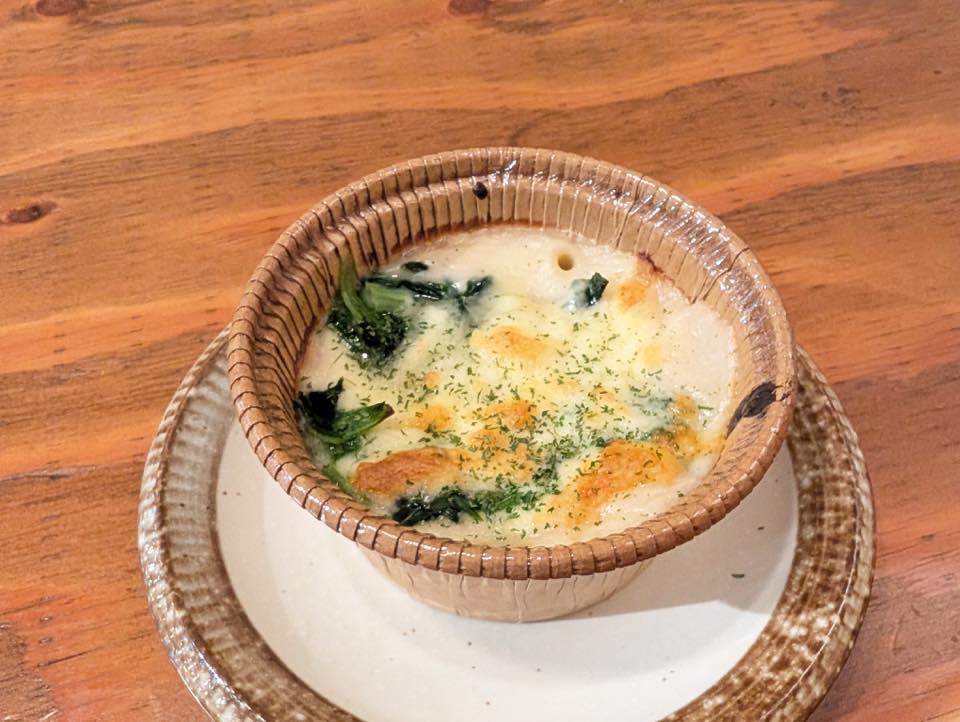 柚子味噌の和のテイストを加えたミニグラタン。エビ、貝柱、ほうれん草、マカロニ入り!